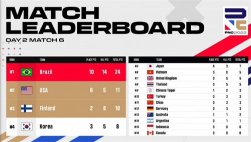 第五局比赛,地图为米拉玛。四阶段,中国大陆队淘汰掉英国队后仅存两人,还没来得及庆祝就在进圈路上被一颗手雷淘汰出局。决赛圈,芬兰队先手淘汰掉加拿大队,同时越南队淘汰掉澳大利亚队后与芬兰队决战,最终芬兰队拿下越南队再吃一鸡。本日积分榜如下: